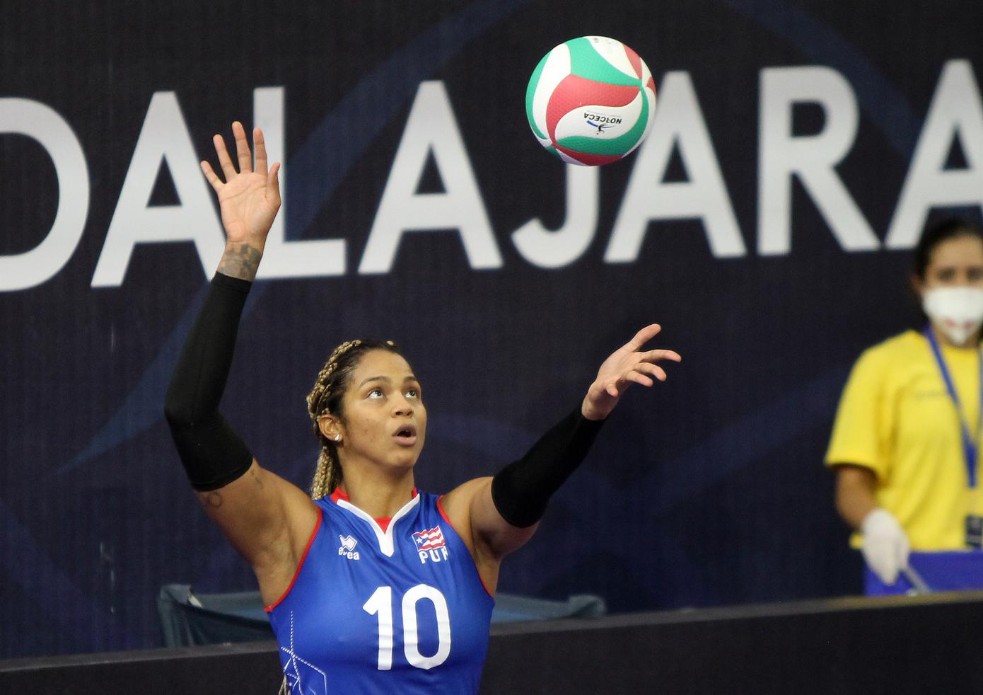La central de Puerto Rico, Diana Reyes, mantiene el ojo en el balón para un servicio ante México en el Campeonato Norceca 2021. (Suministrada/Norceca)