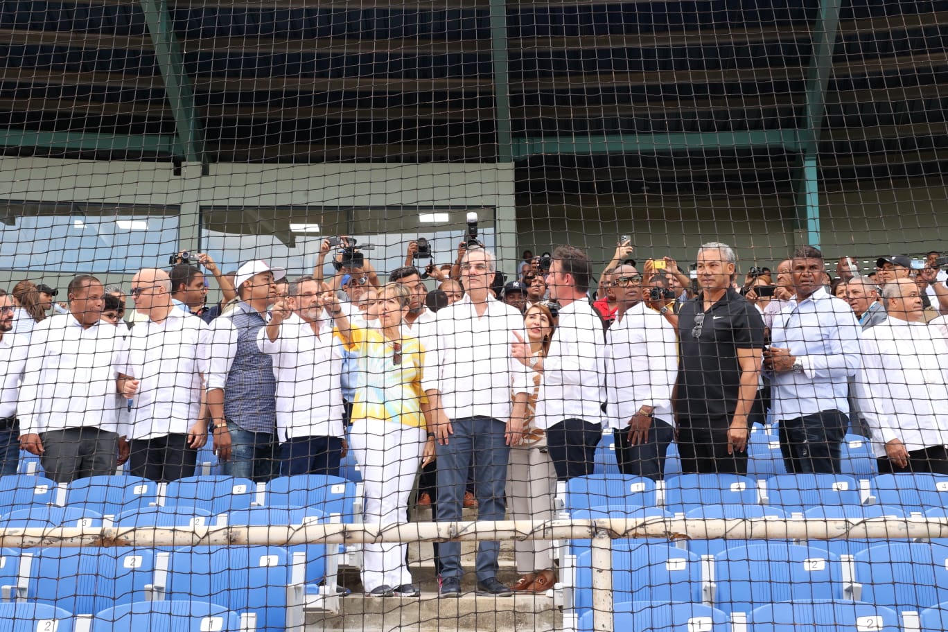 El mandatario llegó a dicho Estadio a la 4:45 de la tarde, acompañado de la gobernadora provincial, Claritza Rochette Senior; el ministro Administrativo de la Presidencia, Igor Rodríguez Durán; la senadora Ginette Bournigal Jiménez; el Comisionado Nacional del Béisbol, Junior Noboa, y el Alcalde de este municipio, Dióledez Roque García, entre otros.