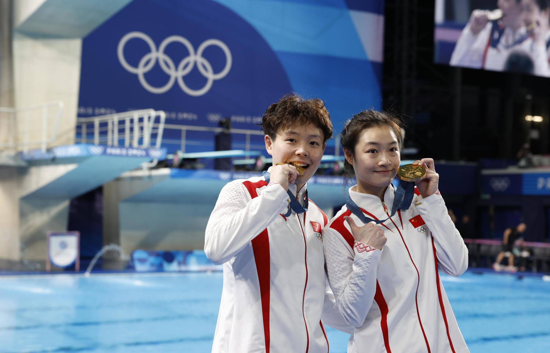 Las saltadoras chinas Chang Yani y Chen Yiwen posan con sus medallas de oro después de ganar la final de trampolín sincronizado de 3 m femenino en los Juegos Olímpicos de París 2024. EFE/EPA/CAROLINE BREHMAN