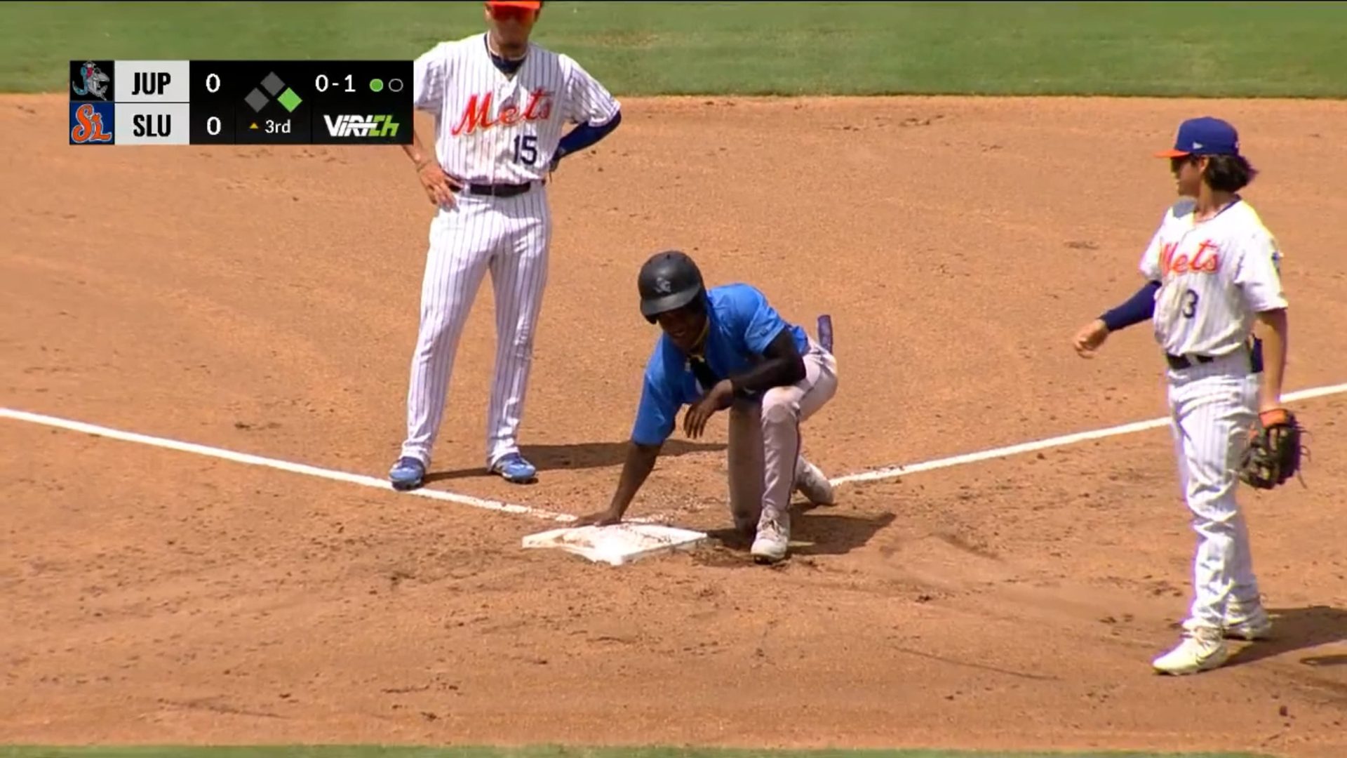 Mostrándose agresivo en la antesala, Lewis vio que la defensa contraria lo descuidó por un momento. Cuando De la Cruz hizo un tiro a la primera base con el corredor partiendo a la intermedia, los infielders de St. Lucie vieron cómo Lewis se estafó la segunda base, tercera base y el plato en el mismo capítulo.