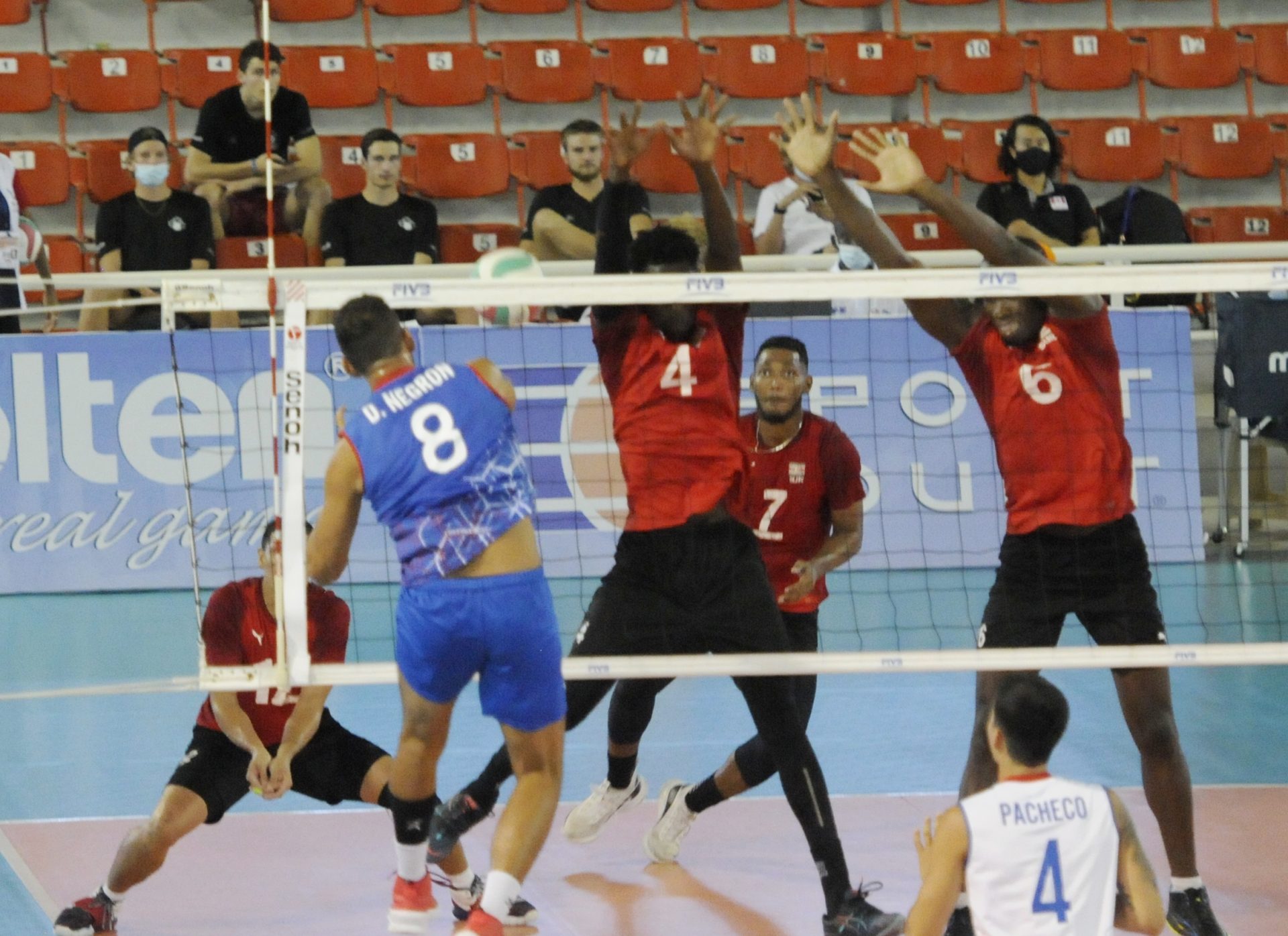 Diego Negrón, de Puerto Rico, consigue un fuerte remate por el centro ante Suriname, ayer. Fuente Externa.