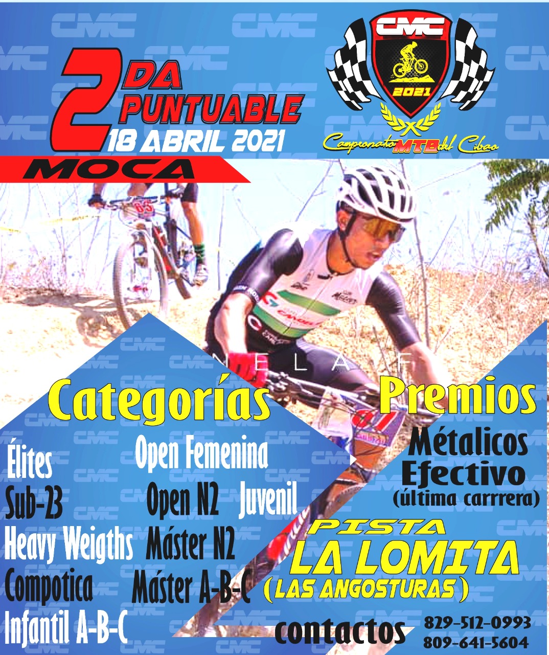 SANTIAGO.- La segunda puntuable del Campeonato de Mountain Bike MTB del Cibao, será corrida el próximo domingo, correspondiendo a la etapa de la Provincia Espaillat, Moca.