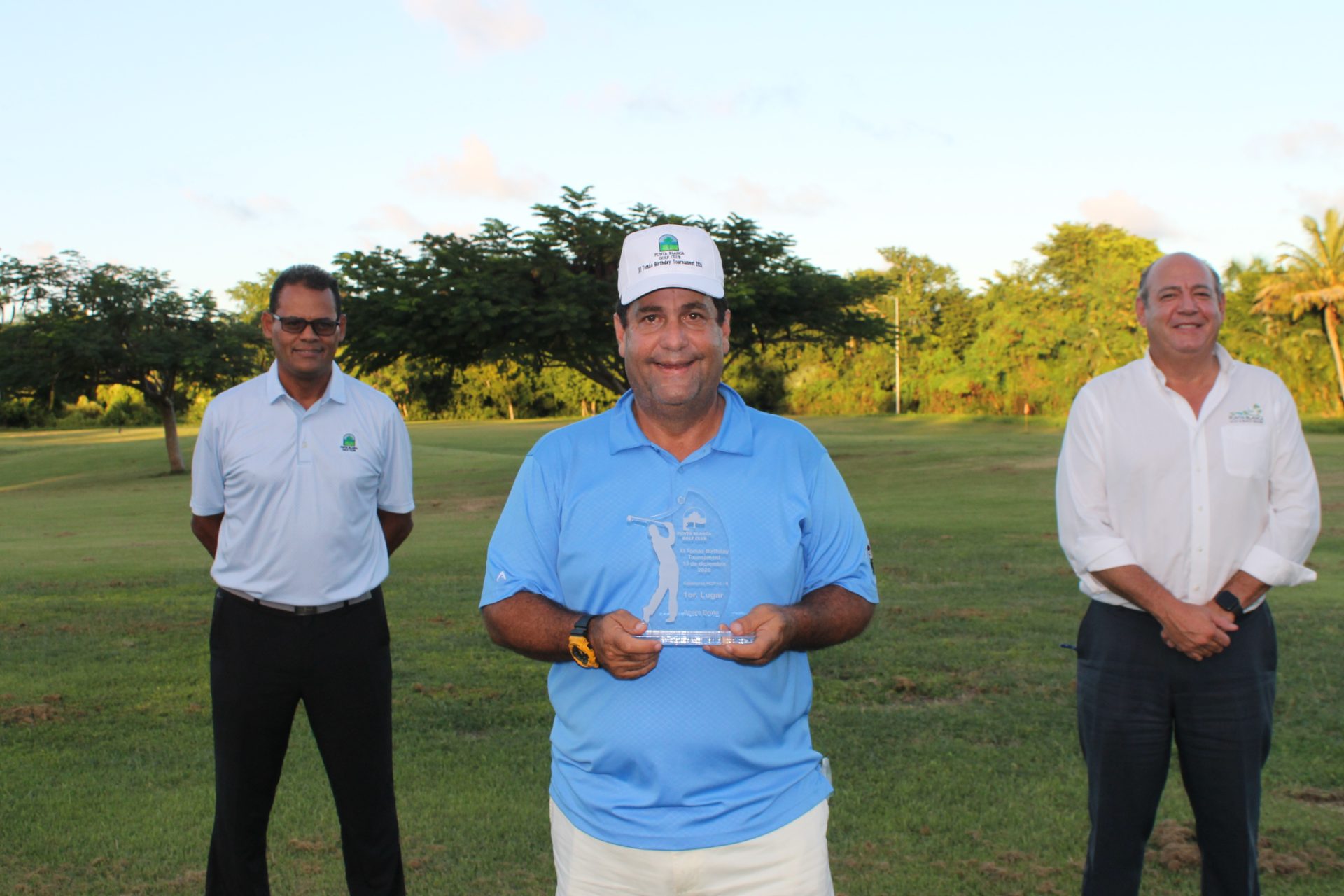 Detrás Antonio Ramis, director general de Punta Blanca Golf Club, Tomás Mercedes, festejado y director de golf de ese campo, delante el gran campeón, Quino Montero. Fuente Externa.