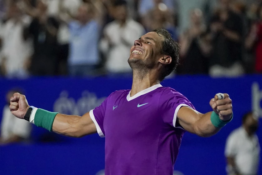 El español Rafael Nadal celebra después de vencer al británico Cameron Norrie en la final del torneo de Acapulco, el sábado 26 de febrero de 2022, en Acapulco, México. (AP Foto/Eduardo Verdugo) (Eduardo Verdugo / Associated Press)
