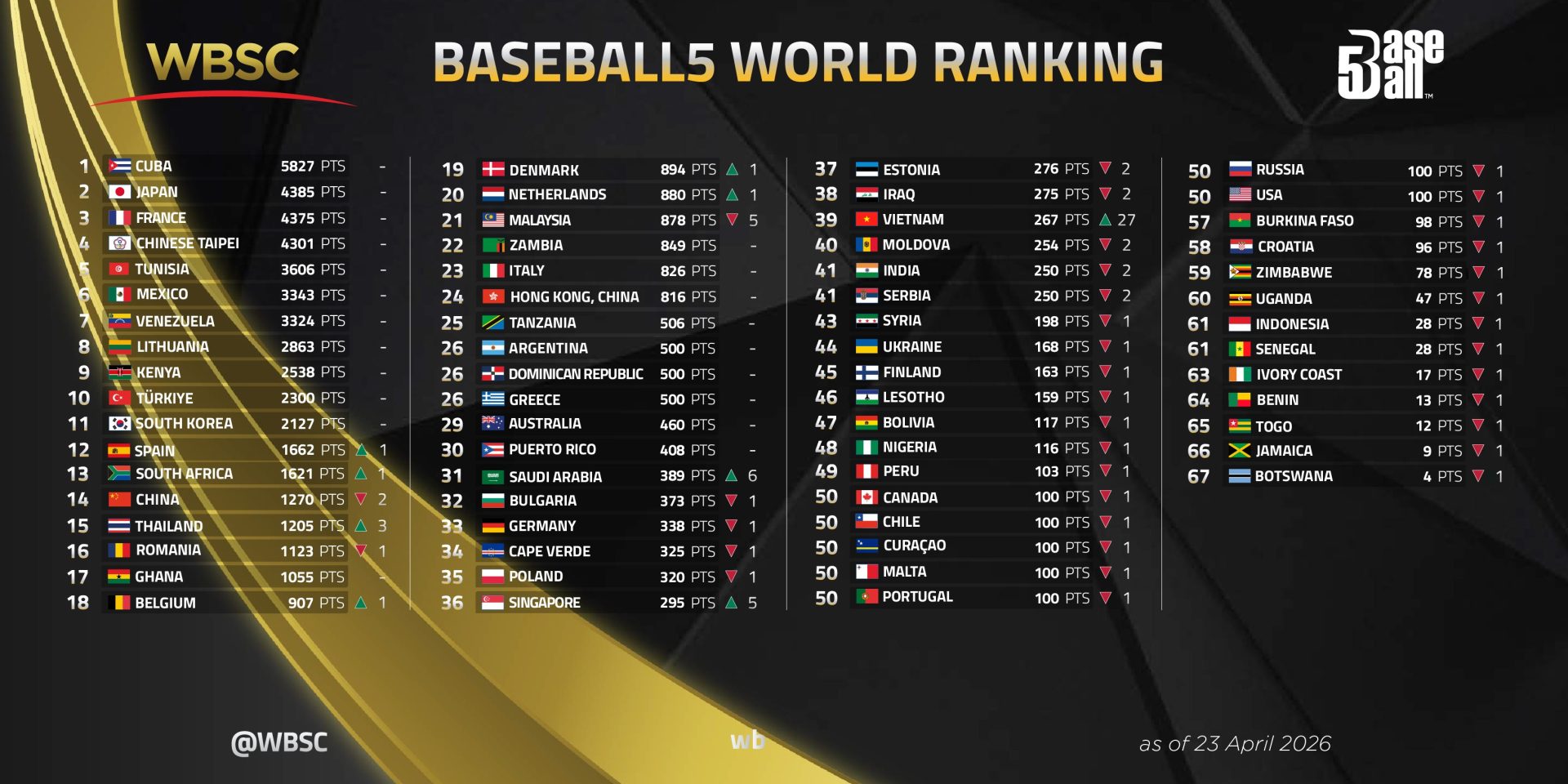 La Confederación Mundial de Béisbol y Softbol (WBSC) ha publicado la última actualización del Ranking Mundial de Baseball5 WBSC tras la Copa Asiática de Baseball5 —torneo clasificatorio para la Copa Mundial de Baseball5 WBSC 2026 en San Juan, Puerto Rico—, con Tailandia y Vietnam como los grandes protagonistas.