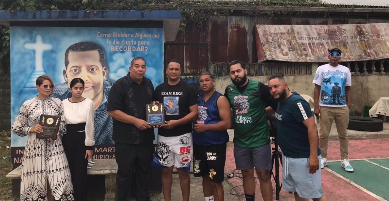 La liga de Baloncesto del club Caonabo aprovecho la ocasión para entregarle una placa de reconocimiento in memoriam a Kike Martínez siendo recibida por su hija Elianny y su esposa Anny Arzeno viuda Martínez.