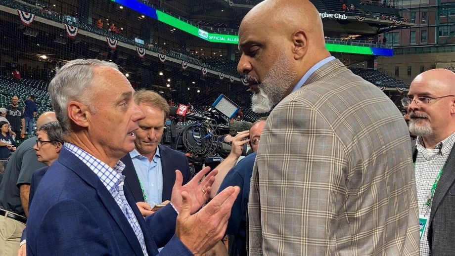 HOUSTON.- El comisionado de las Grandes Ligas, Rob Manfred, estrechó la mano del líder del sindicato de peloteros, Tony Clark, en el terreno, antes del primer juego de la Serie Mundial.
