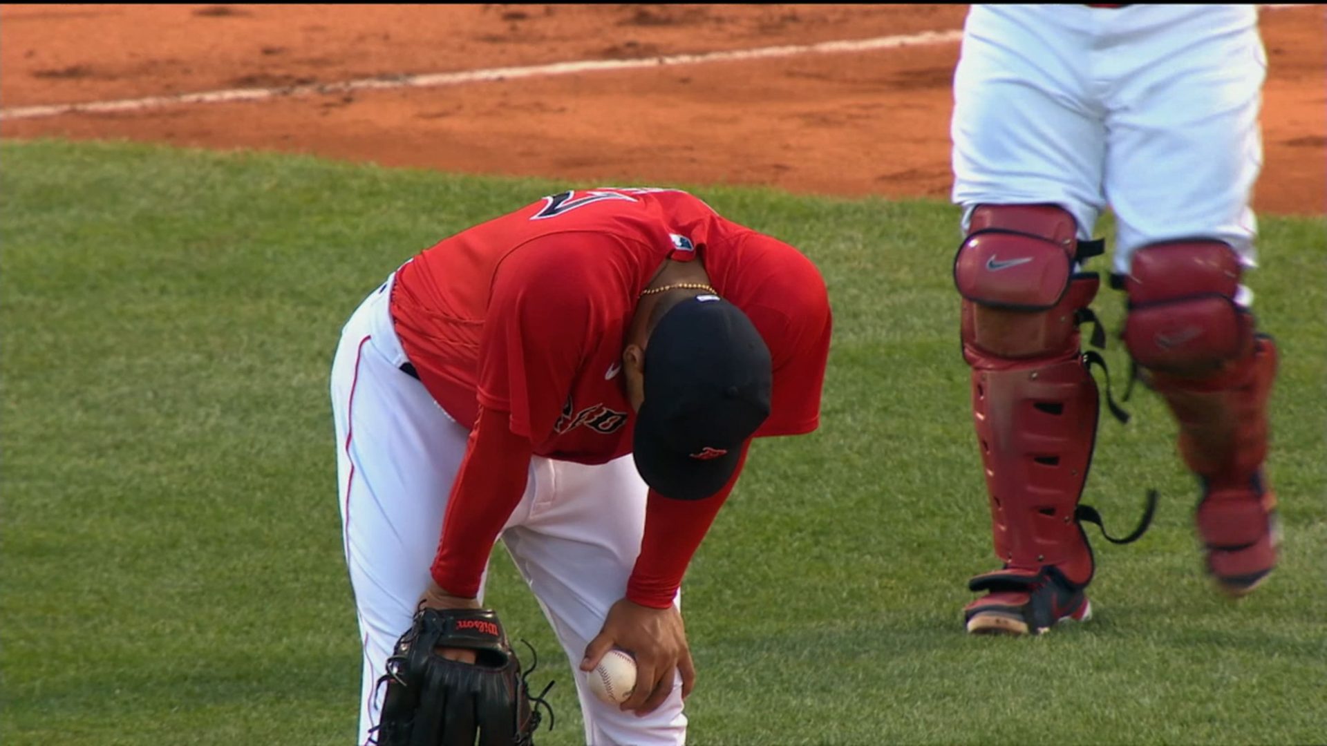 Tras permitir un doble productor a Brett Gardner, Rodríguez fue a cubrir el plato y se tomó la parte baja de la espalda, en un gesto de dolor. Rodríguez le hizo una seña al manager puertorriqueño Alex Cora y a los trainers mientras volvía al montículo.