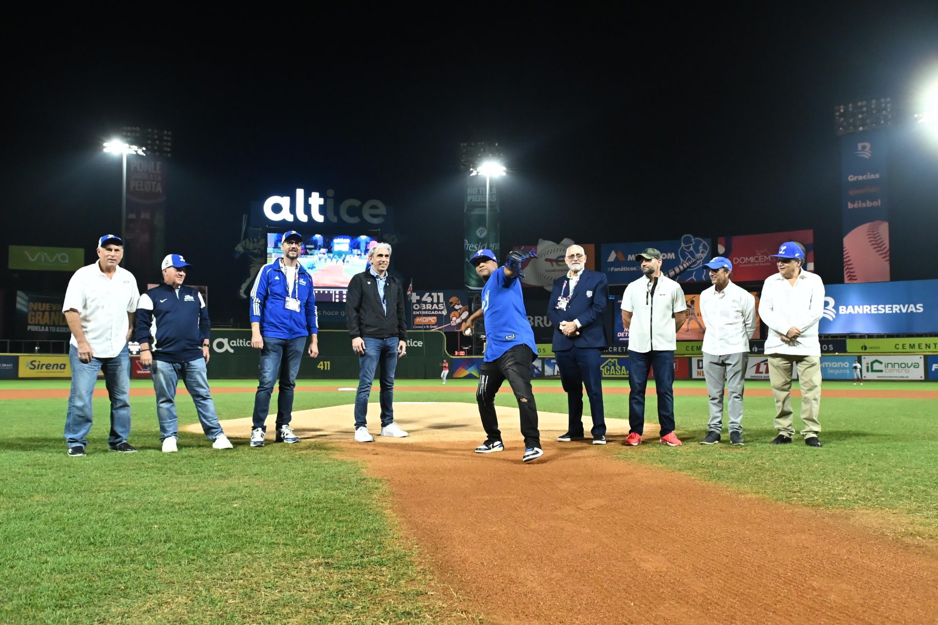Eventualmente, salió por el dogout de los bicampeones caminando sobre una alfombra azul, Ronnie Belliard, jugador histórico y otrora capitán de los azules, quien realizó el lanzamiento ceremonial de la primera bola junto a Manny Martínez, coach de tercera base y su excompañero, que fungió como su receptor de honor.