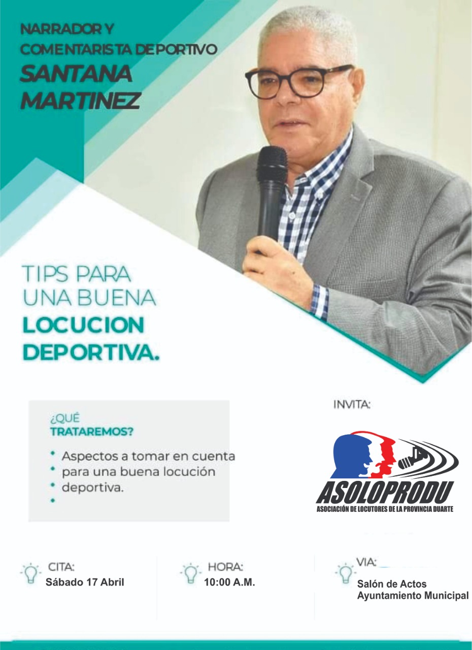 El comunicador deportivo Santana Martínez realizará este sábado 17 de abril una interesante conferencia con motivo a la semana nacional del locutor que organiza la Asociación provincial de locutores que encabeza el incansable Tito Marte.