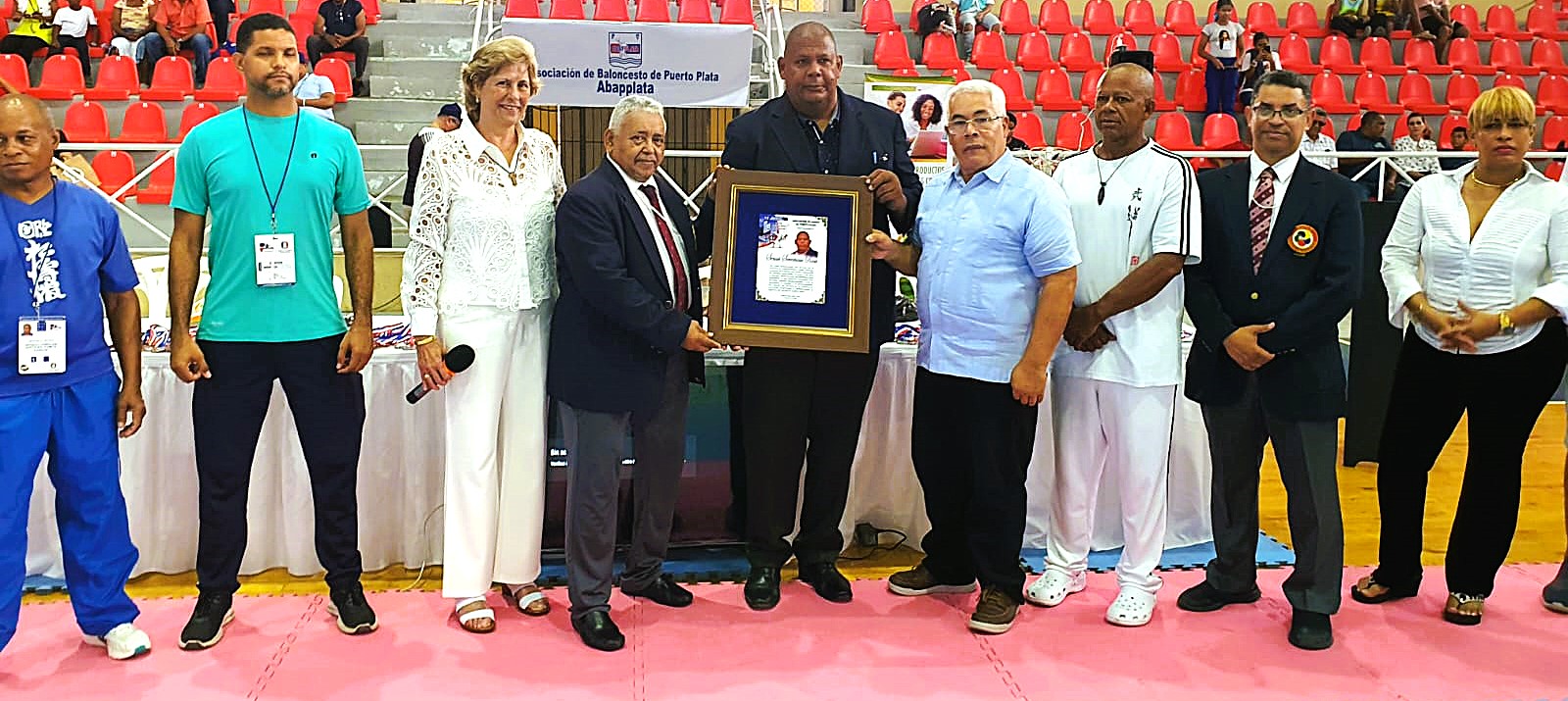 El sensei Severiano Rosa, recibe el reconocimiento que le entregan, José Luís Ramírez, presidente de la Federación Dominicana de Karate; Miguel Ángel Carela, Danilo Martínez, doña Rosita García, José Ubry, Crusito Bueno, Felipe Diaz y otros, el sensei Rosa también logró la copa de campeón por equipos que ganó su selección, Santiago Fuente Externa