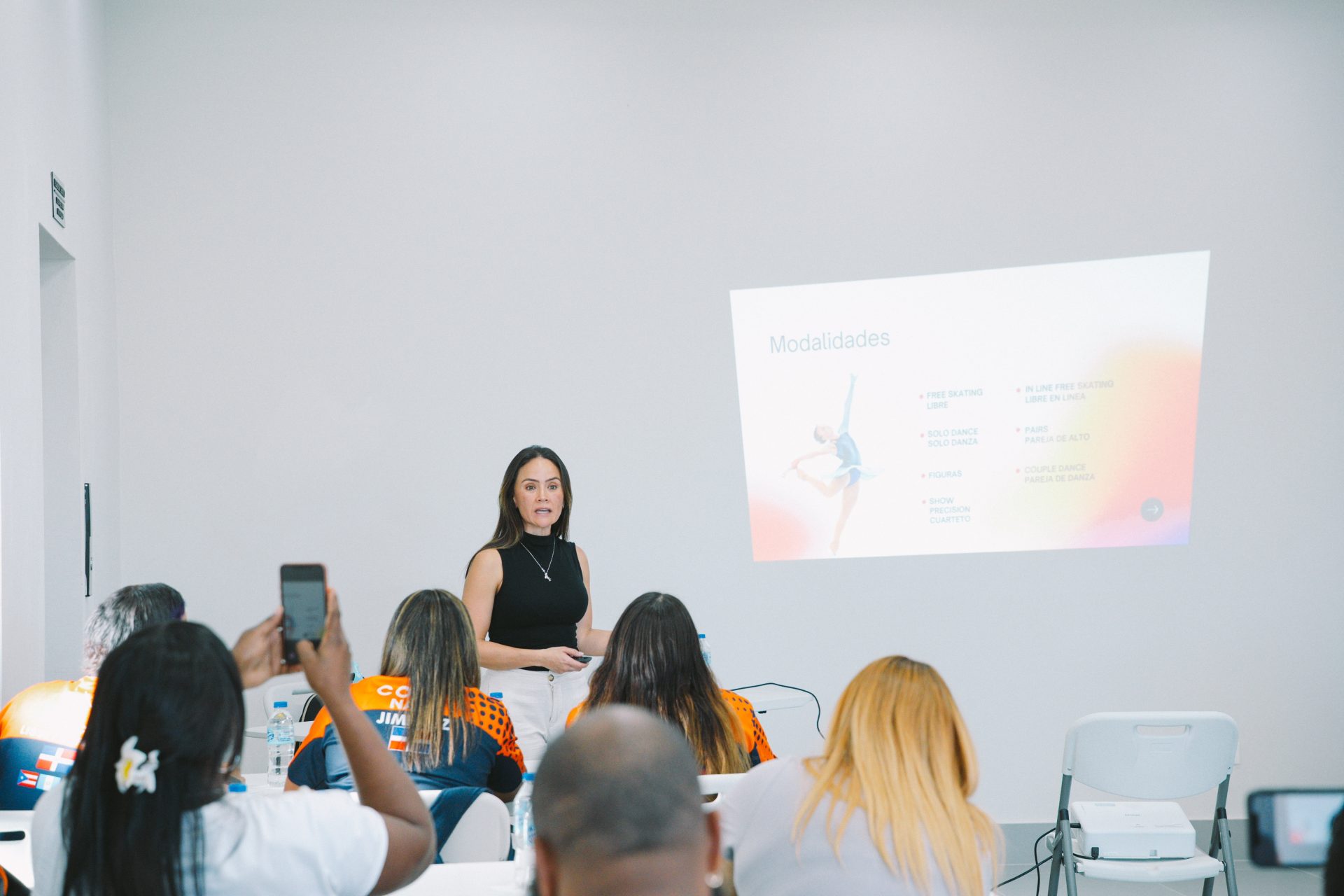 La experta internacional María Isabel Álvarez lideró el curso, sobre el juzgamiento de modalidades como el patinaje libre y la danza individual. Álvarez será la Directora Técnica Internacional en el patinaje artístico para Santo Domingo 2026.
