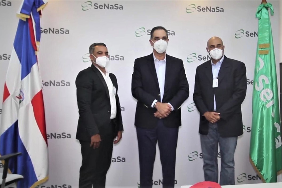 Desde la izquierda Quilvio Veras, Santiago Hazim y Miguel Batista, en la firma del acuerdo mediante el cual SeNaSa proporcionará atención médica a los niños que practiquen béisbol. Fuente Externa.