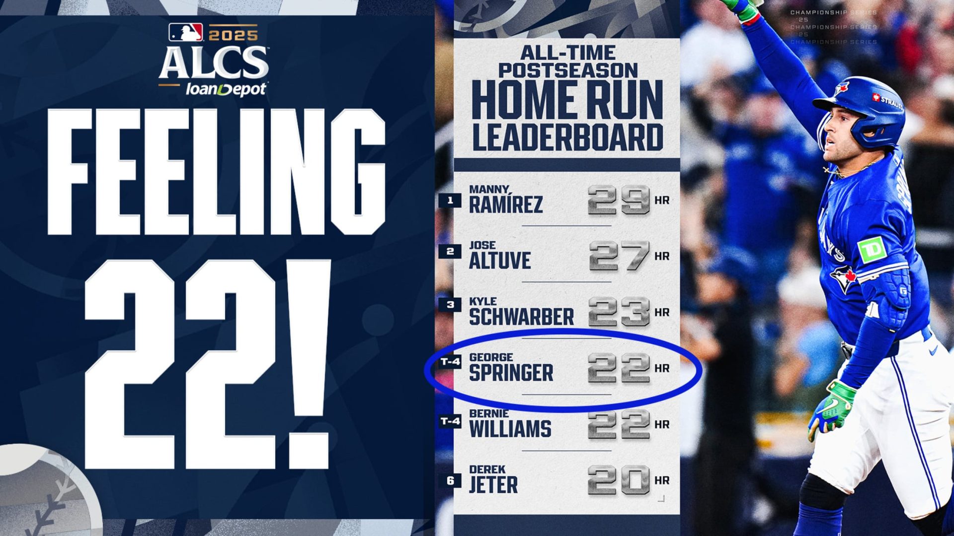 Springer lleva tres jonrones en estos playoffs por los Azulejos. De hecho, con su número 21 de por vida en el Juego 1 de esta serie el domingo, superó en la lista de todos los tiempos al Salón de la Fama Derek Jeter (20), quien ahora es sexto en la historia.