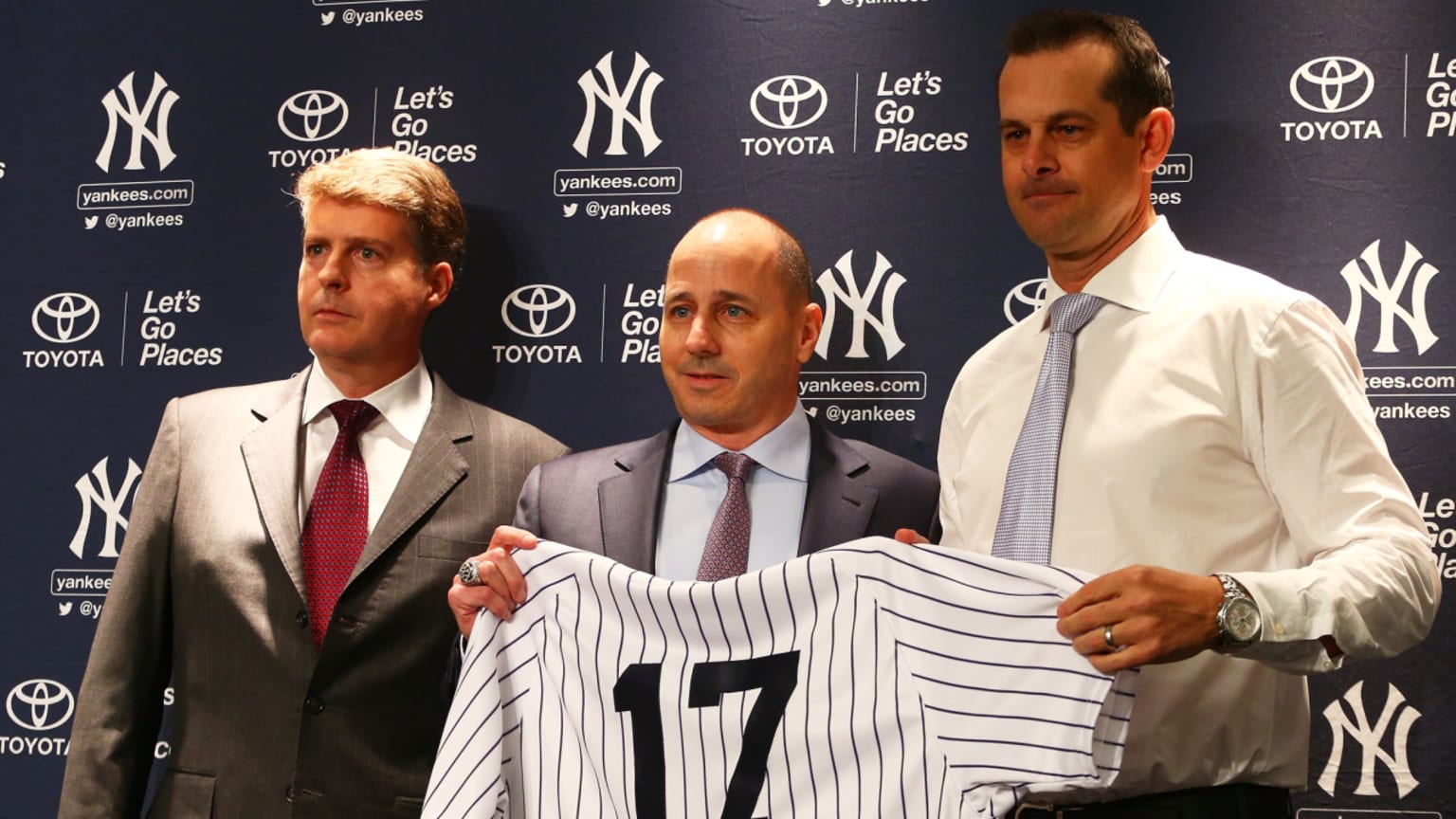 Hal Steinbrenner, Brian Cashman y Aaron Boone. Fuente Externa