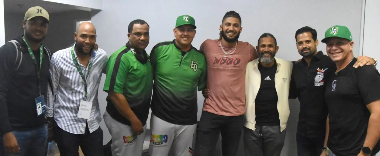 Desde la izquierda, Miguel Peguero, Kremlin Martínez, Wilton Veras, Julio Rangel, Fernando Tatis Jr., Fernando Tatis, Félix Peguero y Pedro López. Fuente Externa.