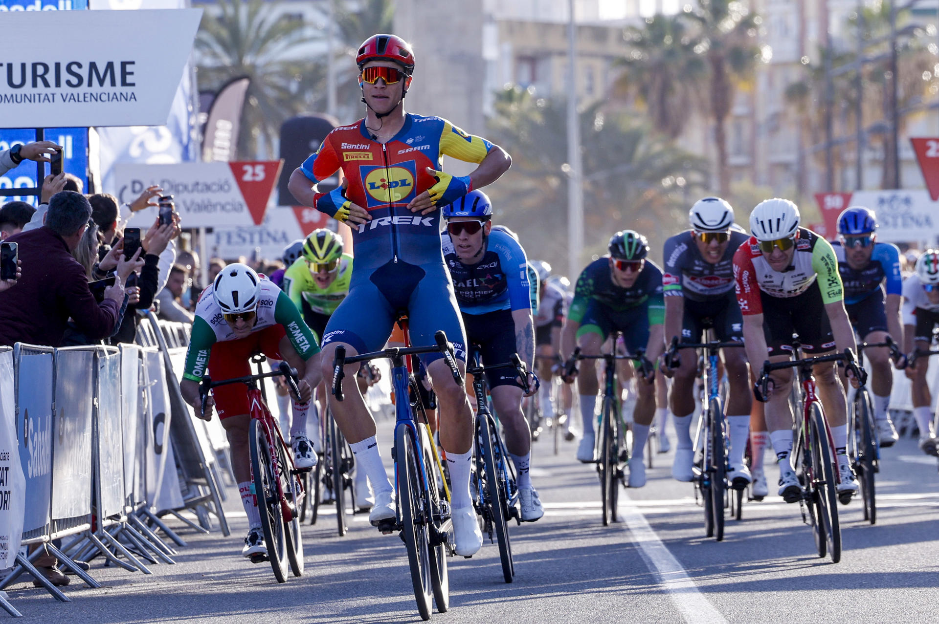 El terreno, plano casi en su totalidad salvo una leve cota a 16 km de meta, se convirtió en un tablero de ajedrez de alta velocidad. Lidl-Trek ejecutó a la perfección el control y el lanzamiento. Cuando llegó su momento, Milan, uno de los mejores velocistas del planeta, saltó sin mirar atrás. Su arrancada fue devastadora. Nadie osó siquiera a succionar su rueda.