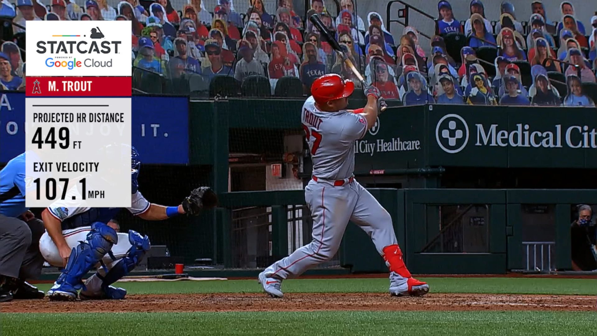 Trout colocó la pelota a 449 pies del plato, en el segundo piso del graderío del jardín izquierdo, y los Angelinos evitaron ser barridos en seis juegos en el Globe Life Field durante esta campaña.