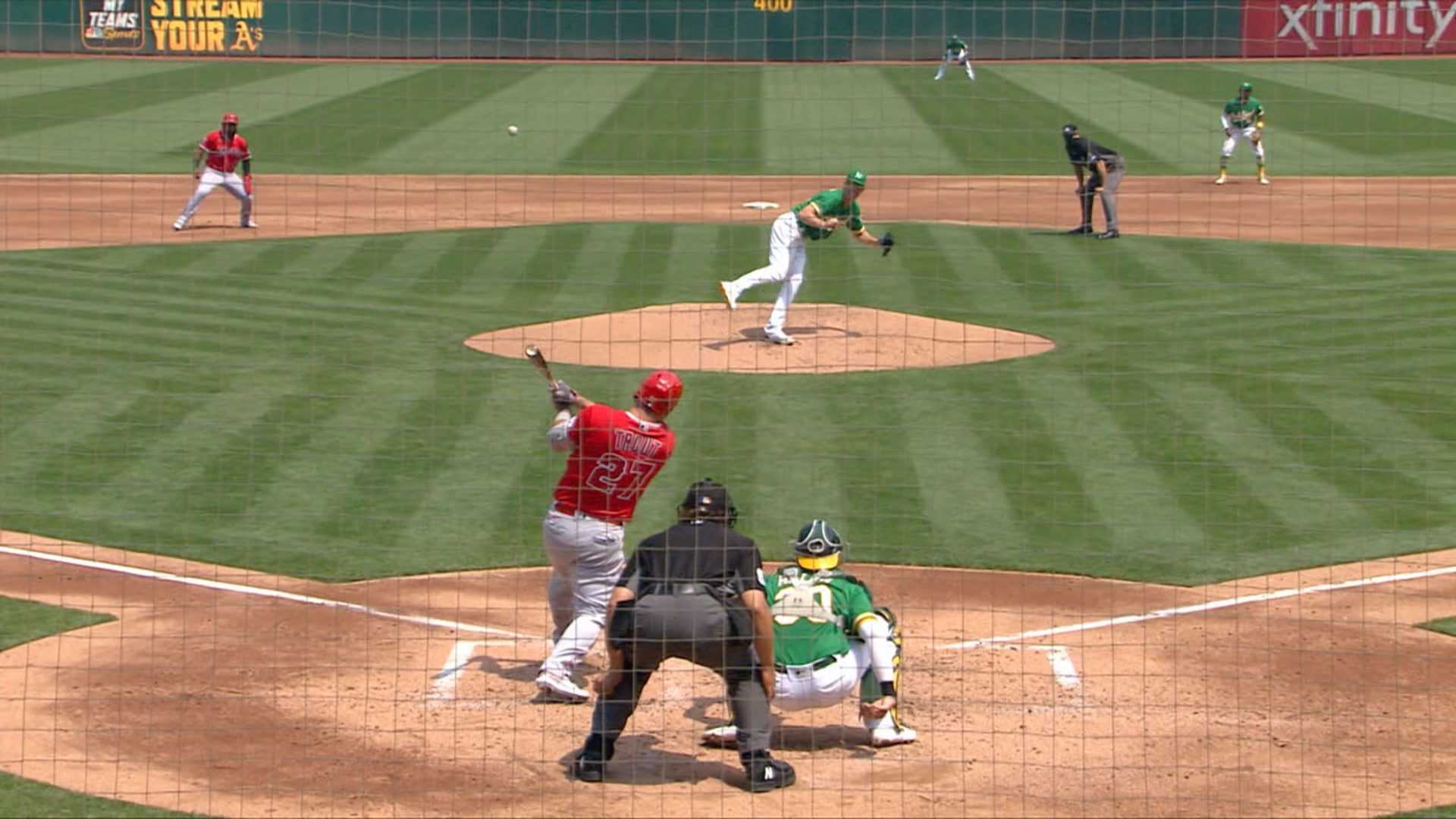 OAKLAND, California, EE.UU.- Mike Trout impulsó tres carreras y realizó una atrapada clave en las postrimerías del duelo, para que los Angelinos de Los Ángeles superaran el sábado 4-3 a los Atléticos de Oakland, quienes vieron cortada una racha de nueve victorias consecutivas en casa.