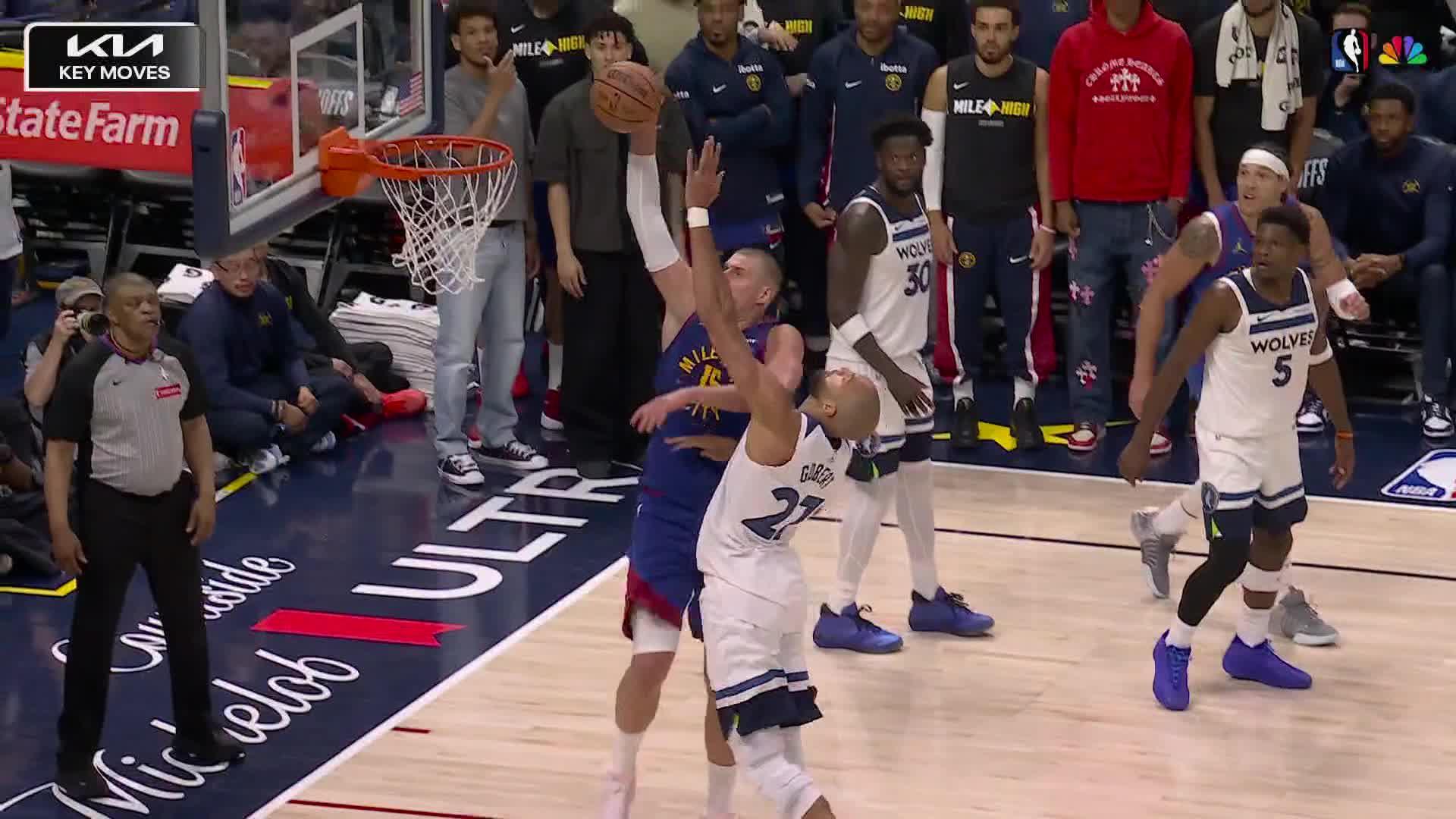 En el primer cuarto, consiguió un par de jugadas de cuatro puntos, recibiendo falta en ambas ocasiones de Ayo Dosunmu.Antes del salto inicial, el entrenador de los Wolves, Chris Finch, se quejó por tercer día consecutivo de la disparidad en tiros libres en el Juego 1, cuando los Nuggets superaron a Minnesota 30-14 desde la línea.