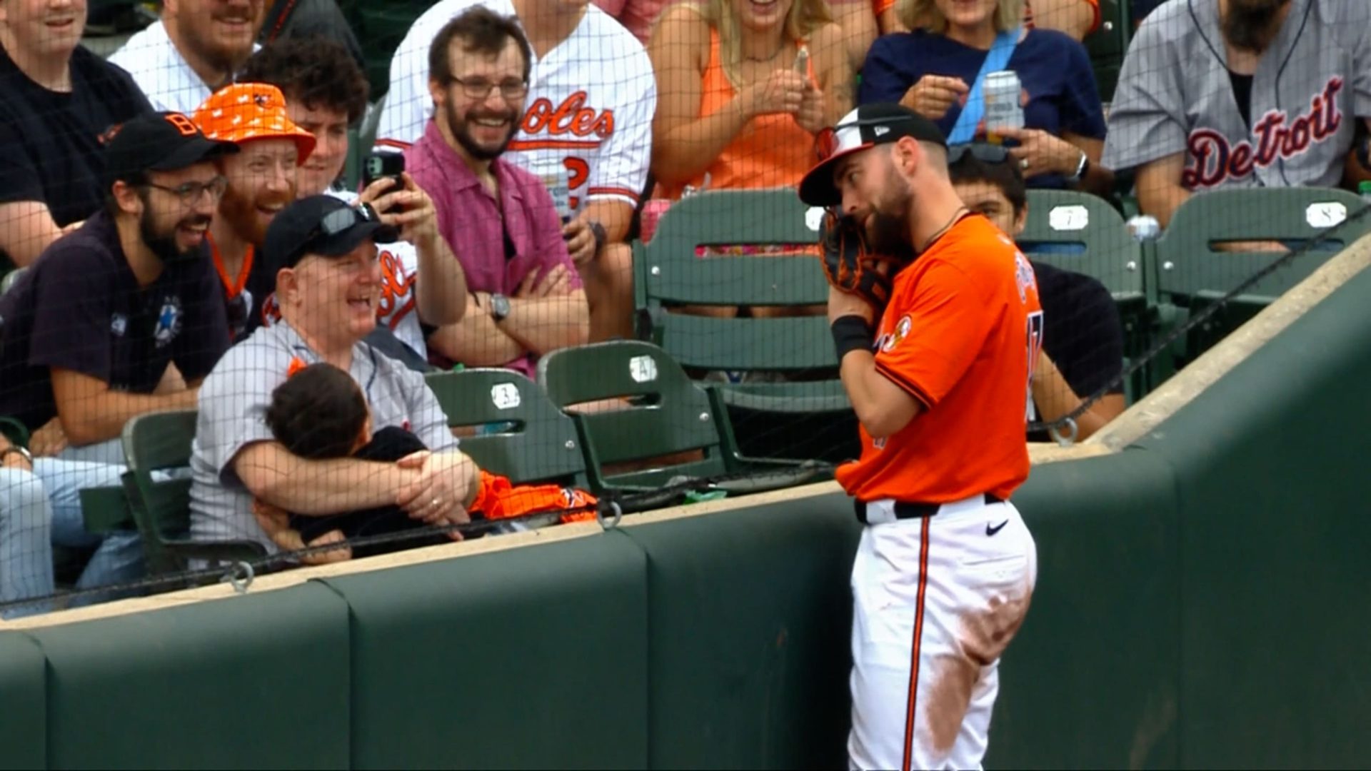El guardabosque de Baltimore, Colton Cowser, cubrió terreno, pero no alcanzó la bola y dio un salto hacia las redes para frenarse. Directamente al frente en la primera fila estaba un padre cargando a su hijo durmiendo. Todos saben que una siesta interrumpida no es buena noticia.