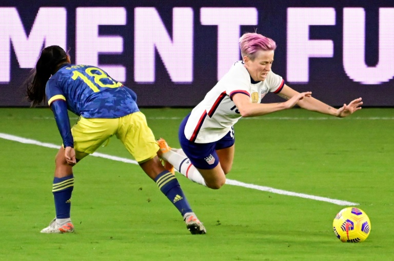 La colombiana Manuela Pavi (izquierda), comete falta sobre la estadounidense Megan Rapinoe durante la primera parte del amistoso del viernes en el Exploria Stadium de Orlando, Florida. Fuente Externa.