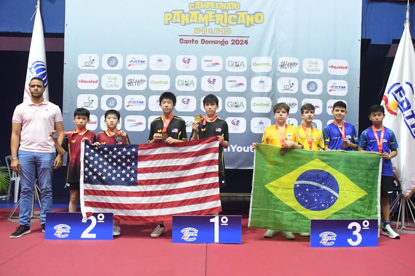 USA B, Jacob Kordus y Ethan Zhou, plata; Evan Dong y Chirag Pradhan, USA A, oro; Luis Ferreira y Joao Ribeiro, Brasil A; Gustavo Borrayo y Omar Ixcaragua, Guatemala B, categoría U11 masculino. Figura José Enrique Rosario, directivo Fedoteme. Fuente Externa