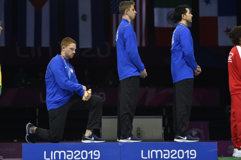 El medallista en esgrima estadounidense Race Imboden hinca la rodilla en el podio de los Juegos Panamericanos 2019. Fuente Externa.