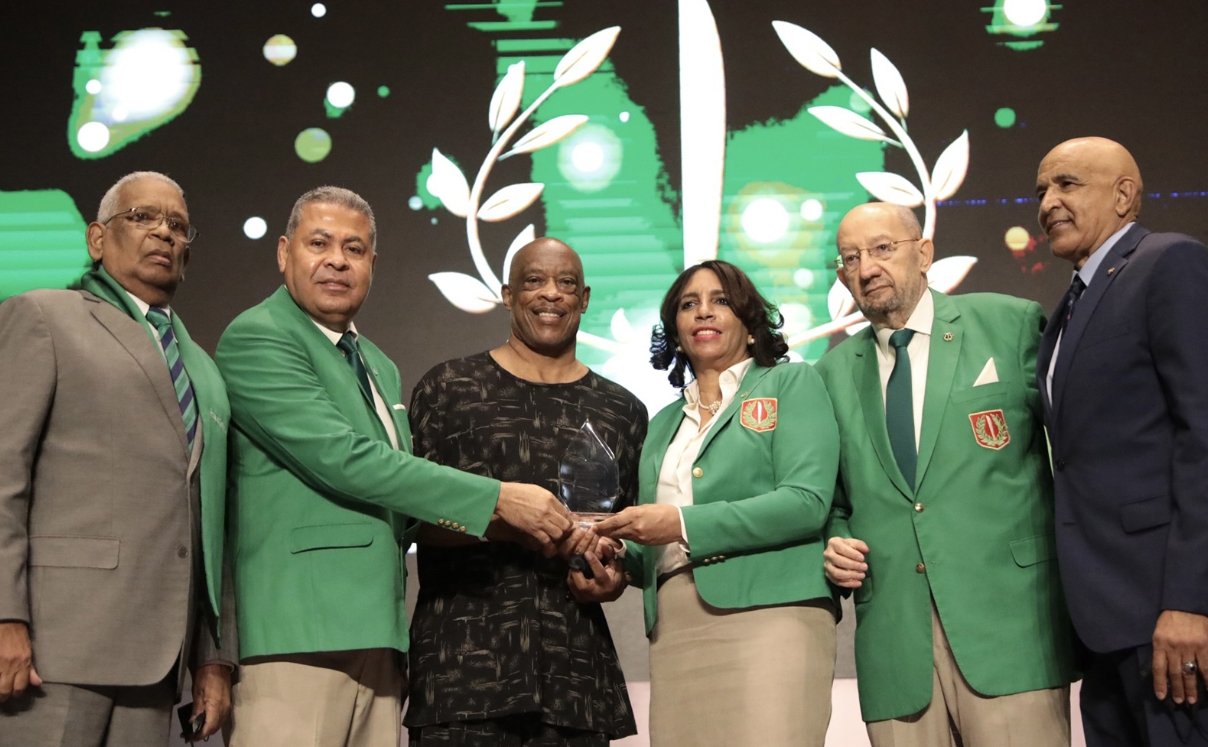 El presidente del Programa CRESO, Felipe Vicini Lluberes, recibe una placa de reconocimiento que entrega Magnolia Concepción en compañía de los doctores William Duke, miembro, y Dionisio Guzman (derecha), presidente del Pabellón de la Fama del Deporte Dominicano.