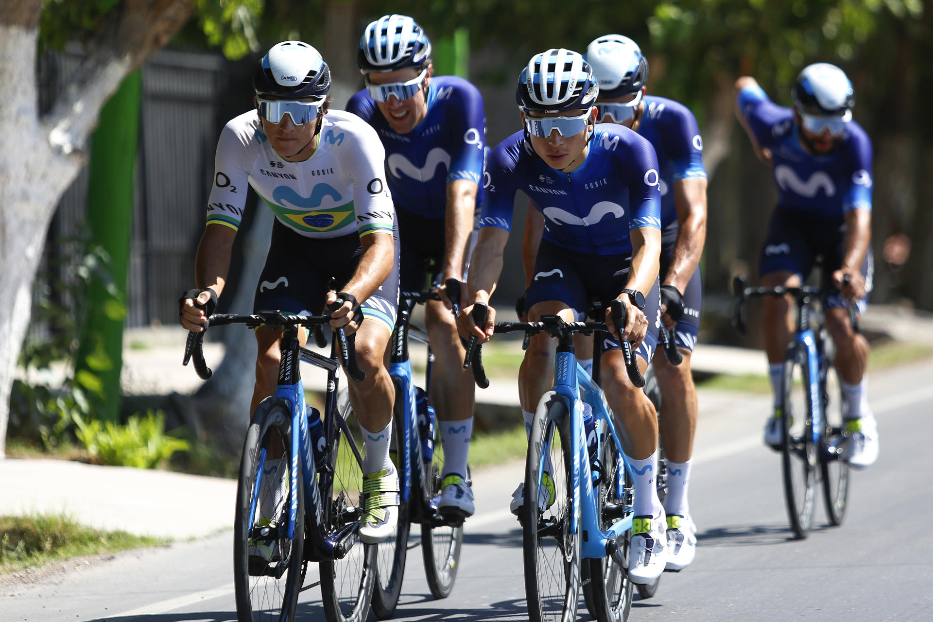 El ciclista brasileño Vinicius Rangel (i), de Movistar durante la primera jornada de la 39 Vuelta a San Juan International 2023 en Argentina. EFE/Maximiliano Blanco/Getty Images