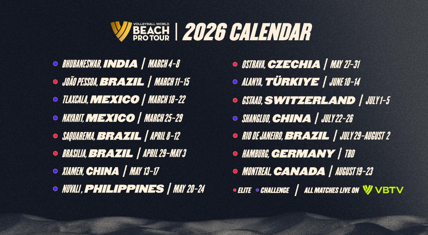 México albergará torneos Challenge consecutivos en Tlaxcala y Nayarit, seguidos por una sólida etapa Elite en Brasil con Saquarema y Brasília. Asia también volverá a recibir eventos Challenge en Xiamen, China, y Nuvali, Filipinas, antes de que el Tour regrese a Europa con paradas en Ostrava, Alanya y el icónico Gstaad, marcando el 26vo año del voleibol profesional de playa en las montañas suizas.