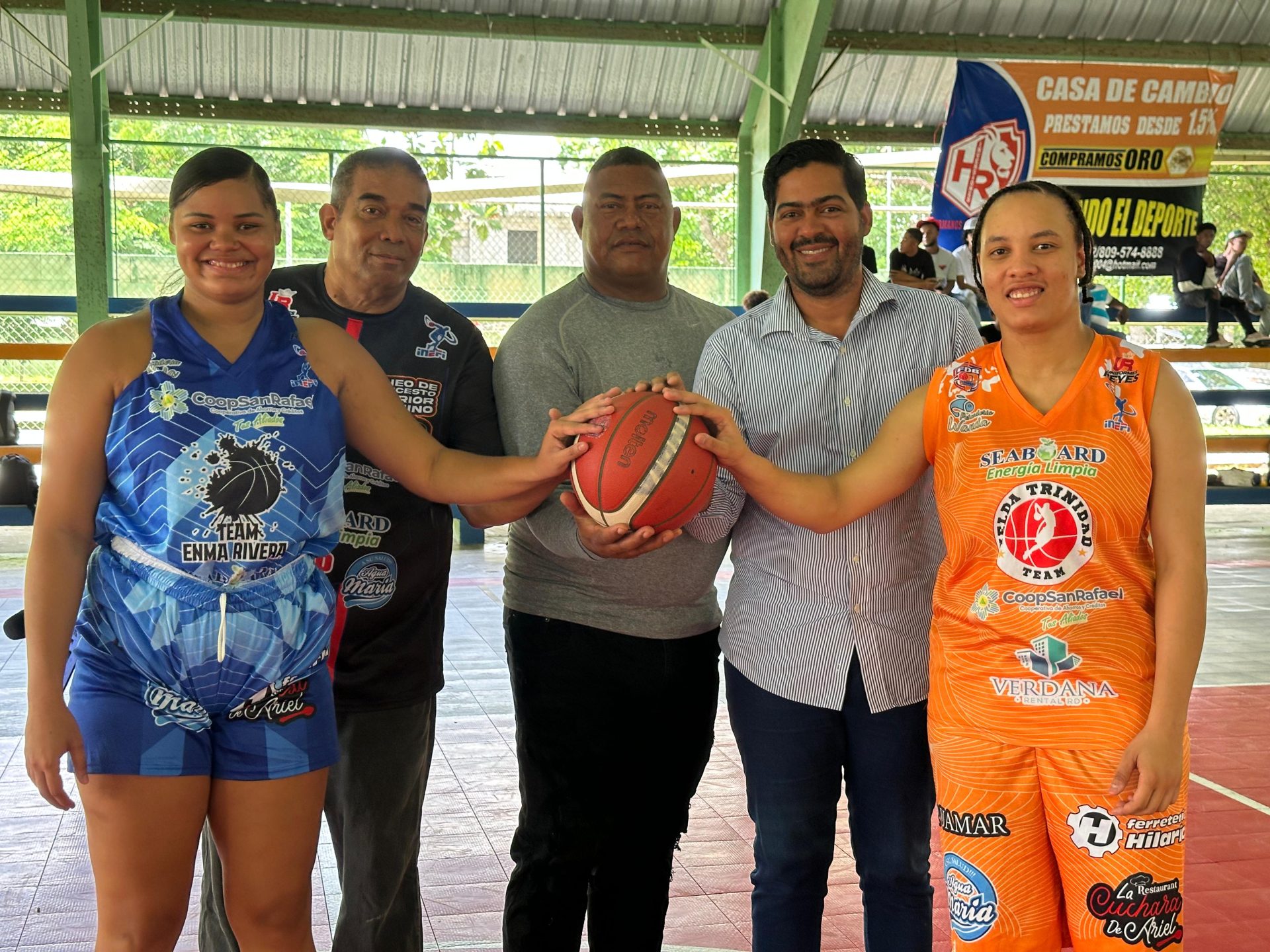 De su lado el destacado deportista Humberto Flores gran propulsor del baloncesto femenino en la provincia Sánchez Ramírez junto al presidente de la Asociación de Baloncesto provincial ingeniero Ariel Peguero realizaron el saque de honor.