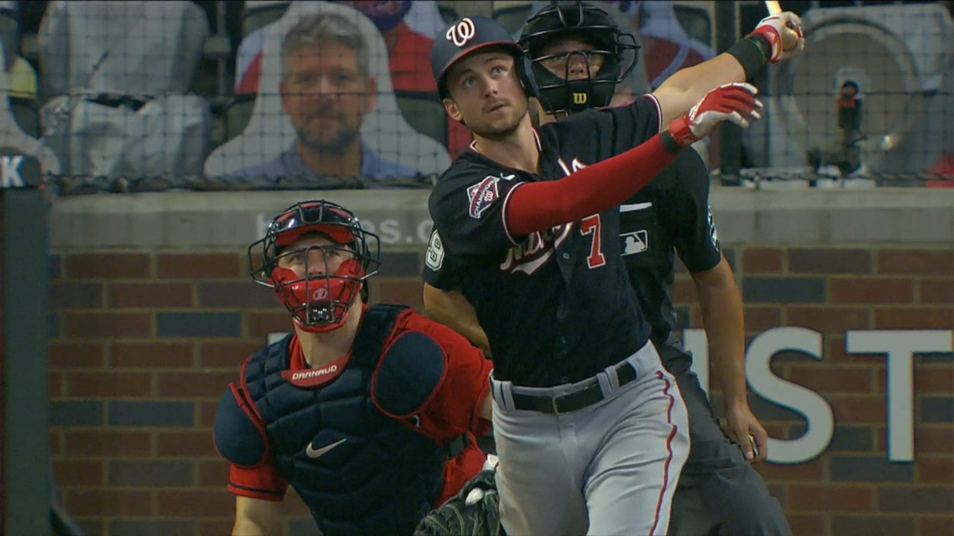 Travis d’Arnaud sacudió un cuadrangular de dos carreras en el séptimo capítulo del segundo duelo, frente al cerrador de los Nacionales, Daniel Hudson, Nick Markakis pegó después una roleta que golpeó una pierna de Hudson y fue fildeada por Turner, quien sin embargo lanzó muy alto a la inicial para un error.