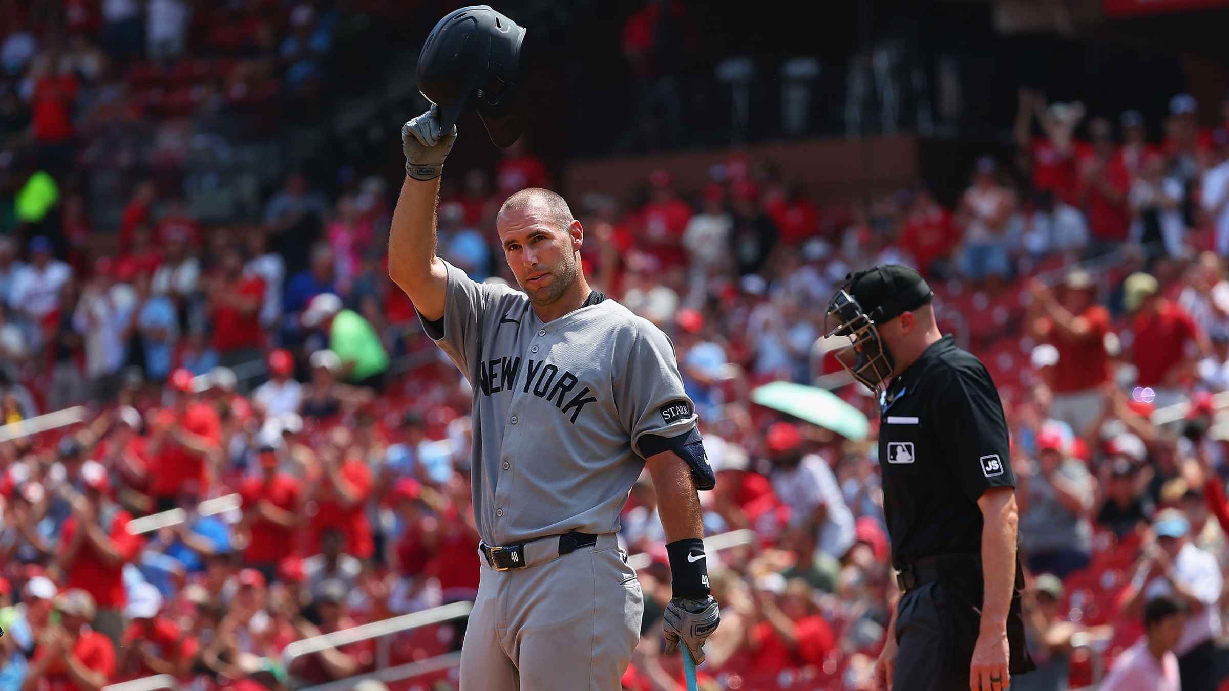 En el lineup abridor por primera vez el fin de semana en su regreso a San Luis después de seis temporadas con los Cardenales, Paul Goldschmidt recibió un aplauso de pie del público y luego respondió con tres pelotas bateadas con fuerza, incluyendo una línea de 110.8 mph entre el jardín izquierdo y el central que no alcanzó a pasar la cerca por apenas pulgadas en el cuarto. Ese doble fue el primero de cuatro hits consecutivos para los Yankees en ese inning, contribuyendo a un rally de tres anotaciones. Goldschmidt luego le daría a Nueva York algo de tranquilidad con un doble impulsor en el noveno.