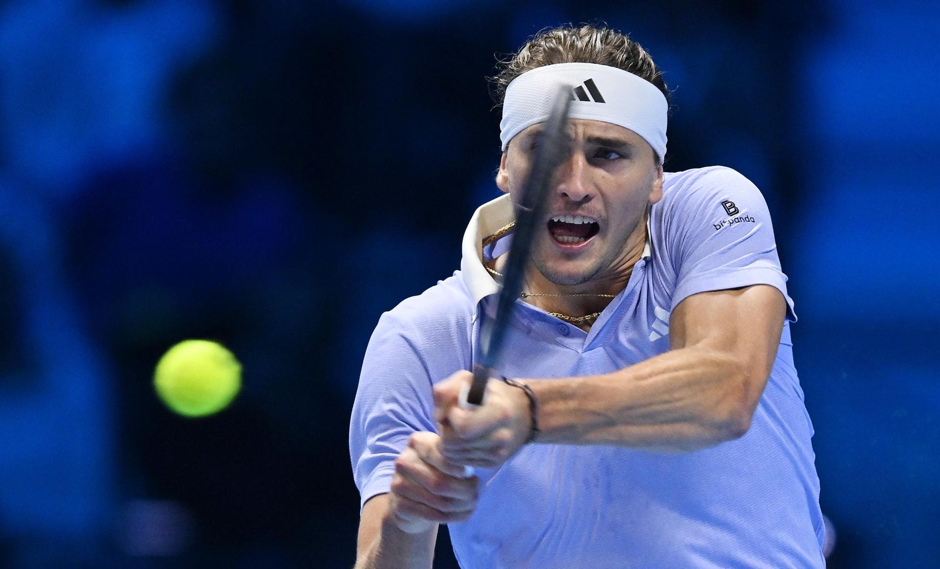 Alexander Zverev en acción durante su partido contra Andrey Rublev en las Finales ATP en Turin, Italia. EFE/EPA/ALESSANDRO DI MARCO